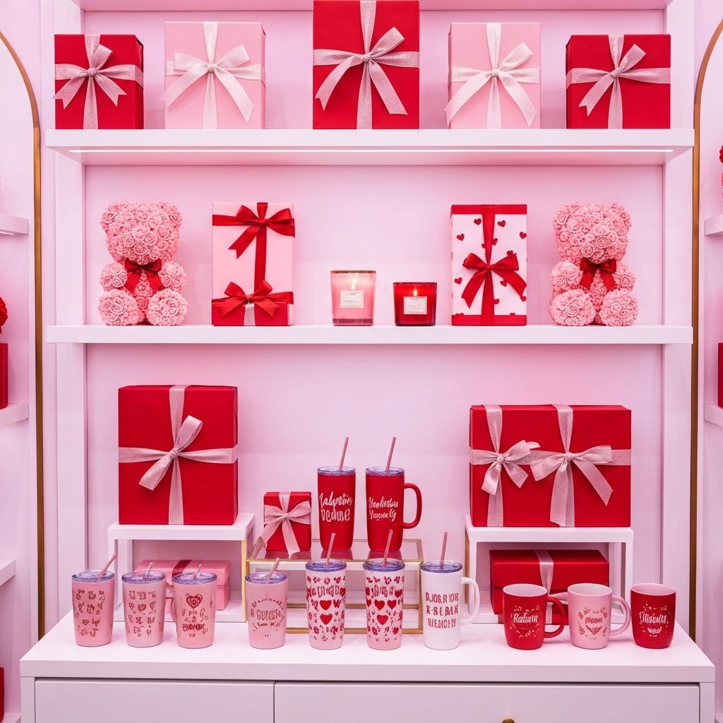 Pop-up-Shop mit besonderen Geschenkideen: Tumbler, Tassen, Kerzen, Deko, Rosenbären und internationale Süßigkeiten zum Valentinstag.